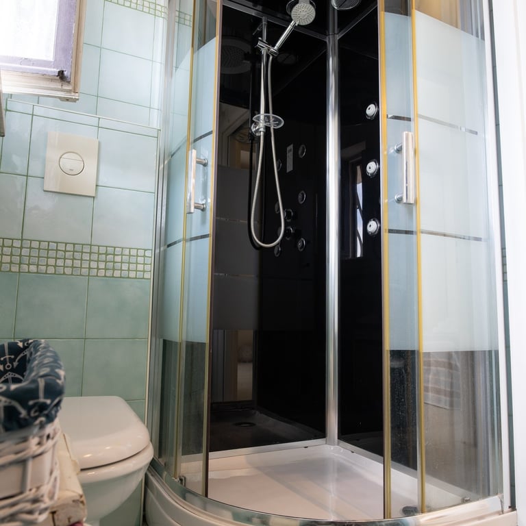 * On the first floor: - Two comfortable bedrooms, each with a double bed and both with balcony access. - Second bathroom with a large shower.