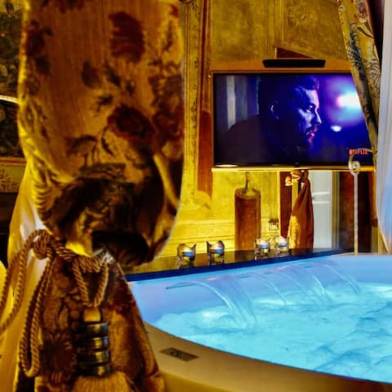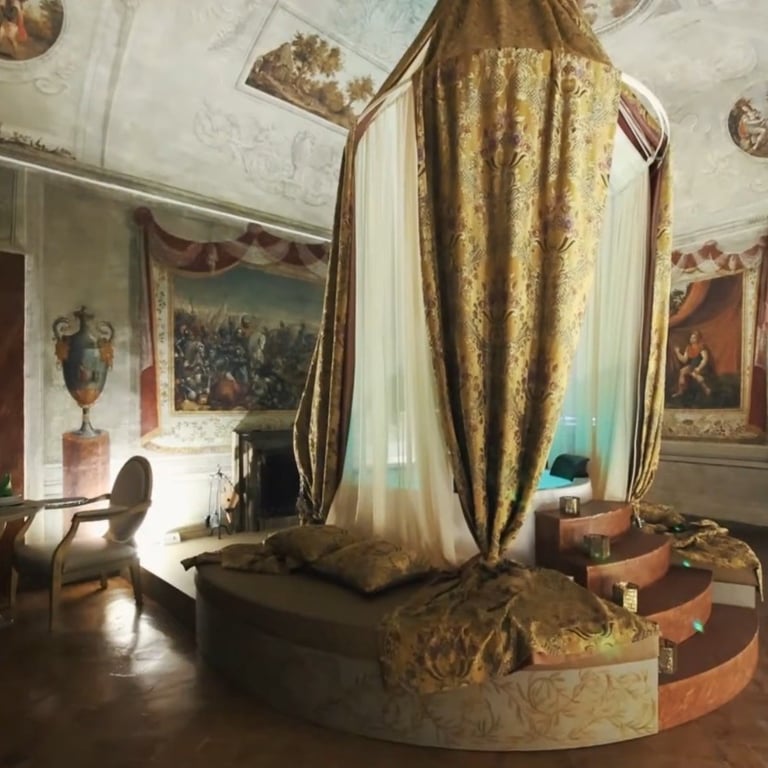 Suite di rappresentanza esclusiva situata al piano nobile di un palazzo storico seicentesco, a 20 metri dal Tempio della Sibilla e con vista diretta e frontale sulla Cascata Grande dell’Aniene e sulla forra della Villa Gregoriana. Affreschi e pavimento originali del 600, idromassaggio, Cromoterapia, Camino, Tecnologia e antichità che si fondono. Benvenuti nella favola di Suite Impero. Vivi Tivoli come se fossi in una favola